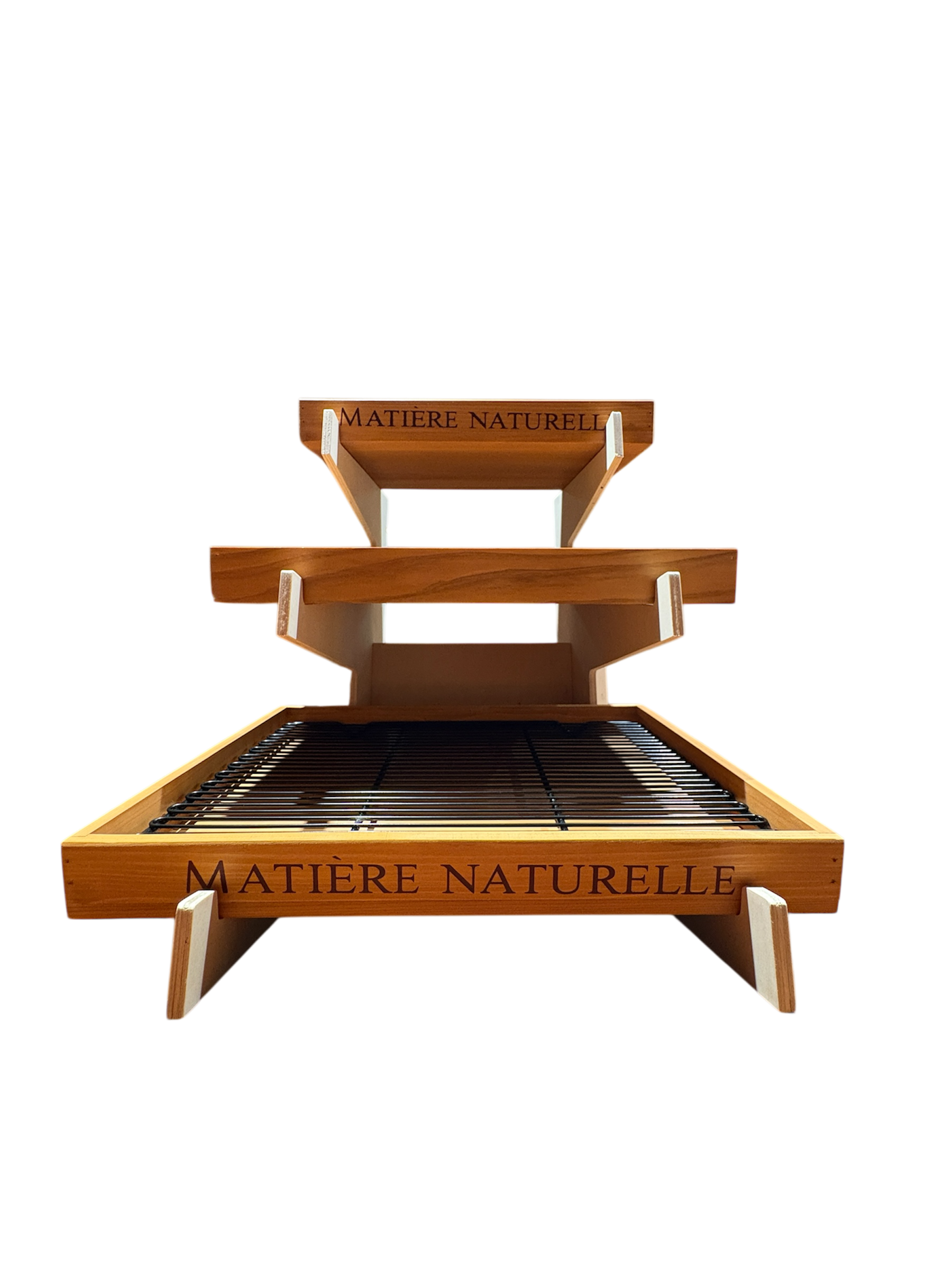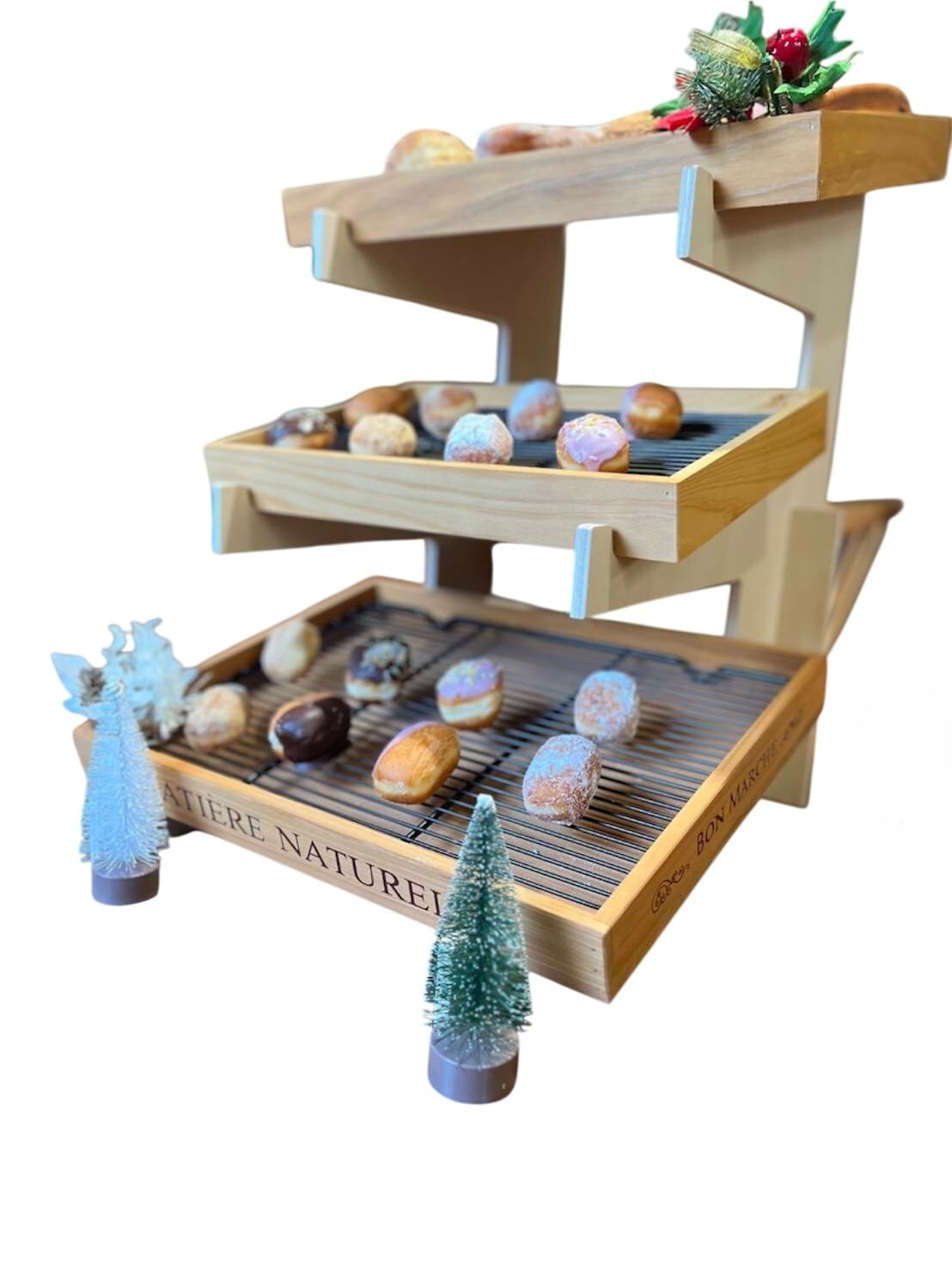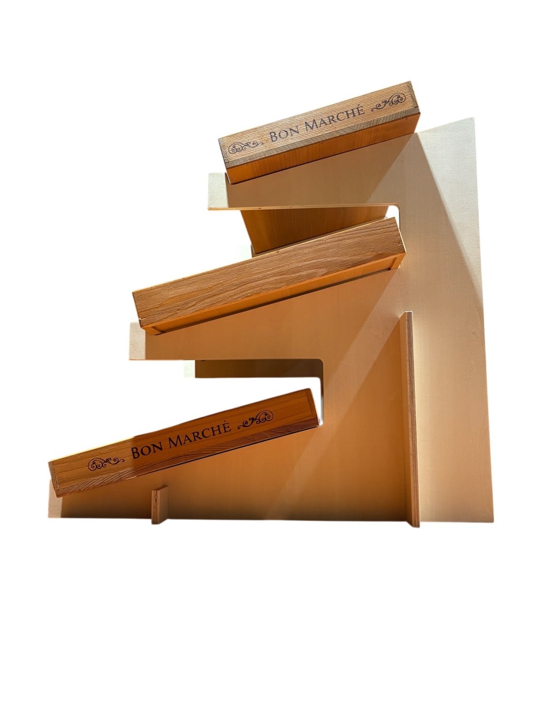 空間を立体的に活用し、商品の魅力を最大限に引き出すディスプレイセットです。 傾斜台に専用のマルシェボックスとワイヤーすのこを組み合わせることで、ボリューム感のある陳列を省スペースで実現します。 温かみのある天然木の質感と、シックなアイアン調のワイヤーが、洗練された店舗空間を演出します。